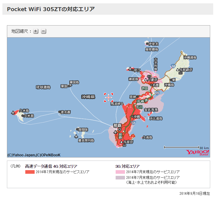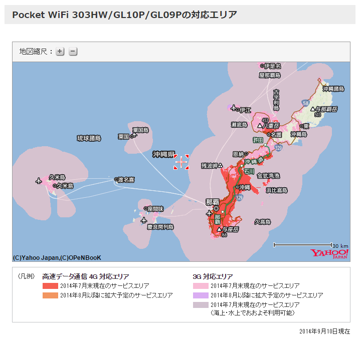 参考までに、私が住んでいる沖縄本島での『Pocket WiFi 305ZT』と『Pocket WiFi GL10P』のエリアを比較してみると…