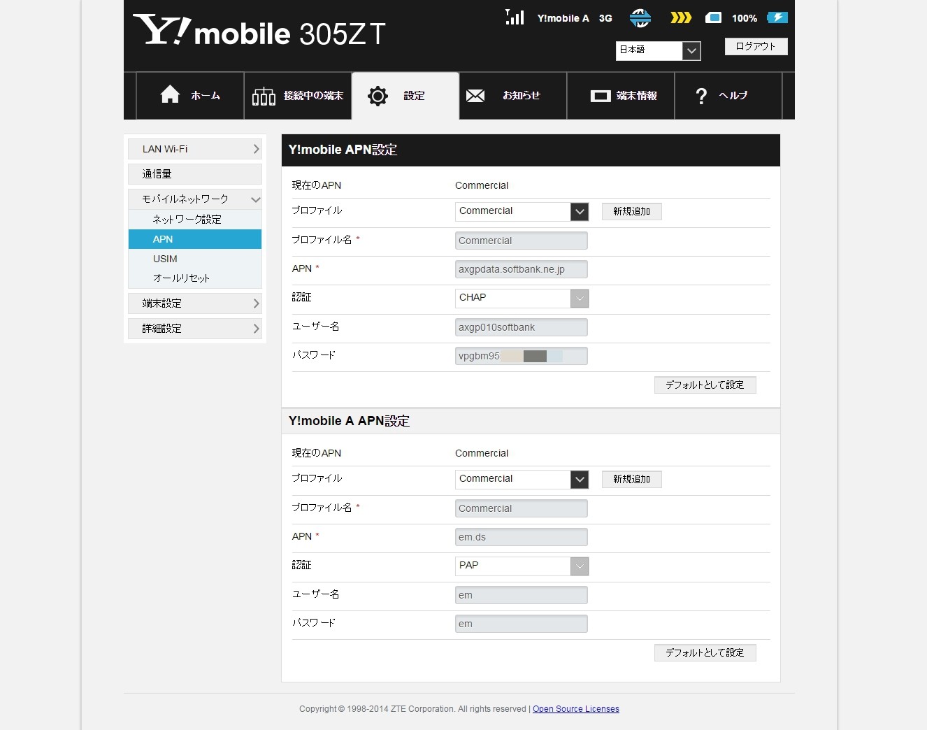 まず最初に、305ZTには2014/12/16時点でIMEI制限がかけられていると思われ、APNが分かったところで他の機種で設定しても接続できないようです。