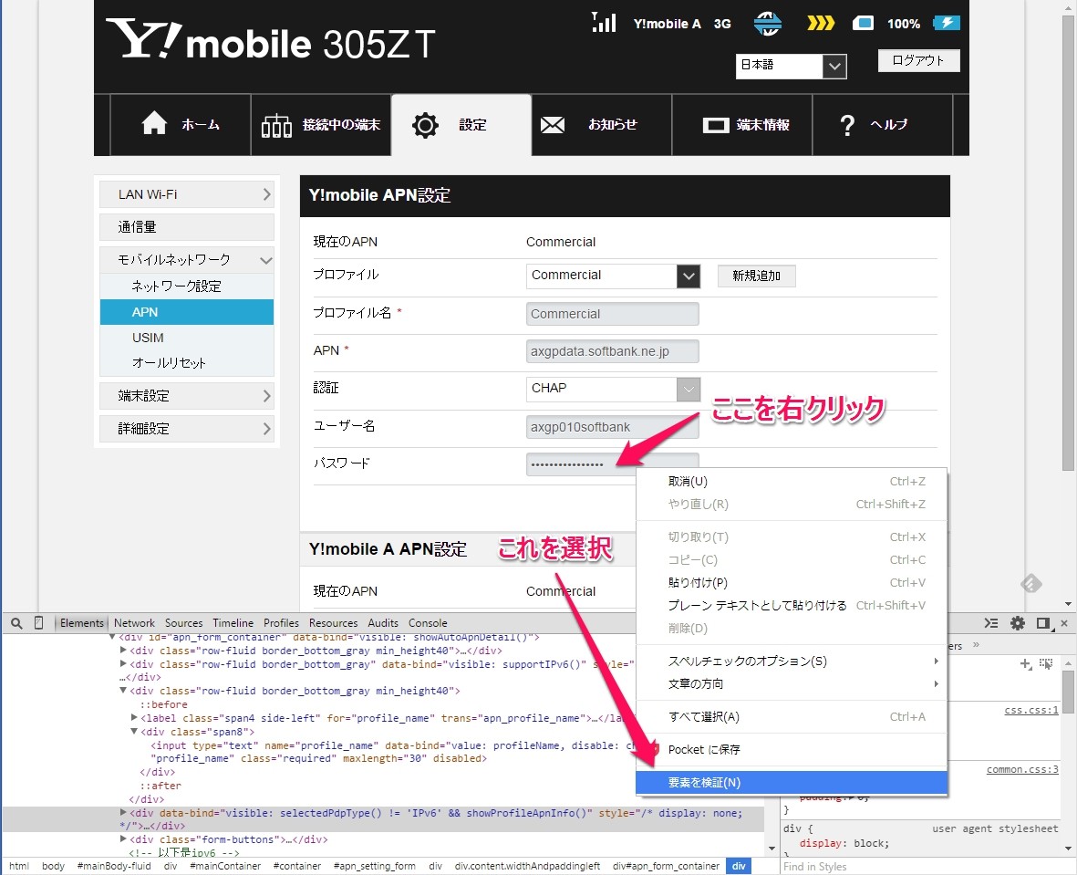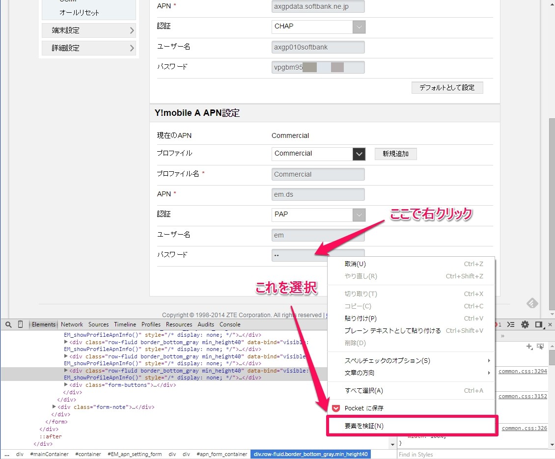 次に、隠されているパスワード部分を表示させます。【●●●●●●●●●●】部分で右クリックし、「要素を検証」を選択。