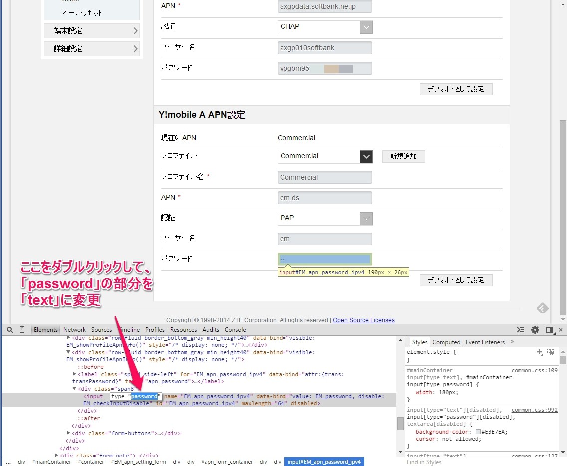青く選択された部分の【type=”password”】を【type=”text”】に変更。